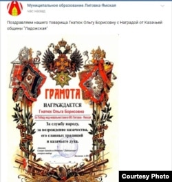 Казачье общество Ладожская гвардия вручила депутату совета Лиговка-Ямская в Петербурге грамоту "за победу над навальнистами". Фотография грамоты размешена в группе муниципального образования.