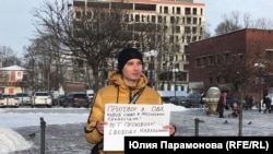 Калининградский блогер Николай Горелов, которого обвиняли в реабилитации нацизма за созданный им сатирический рассказ, пришел с плакатом "Отпустите Навального".